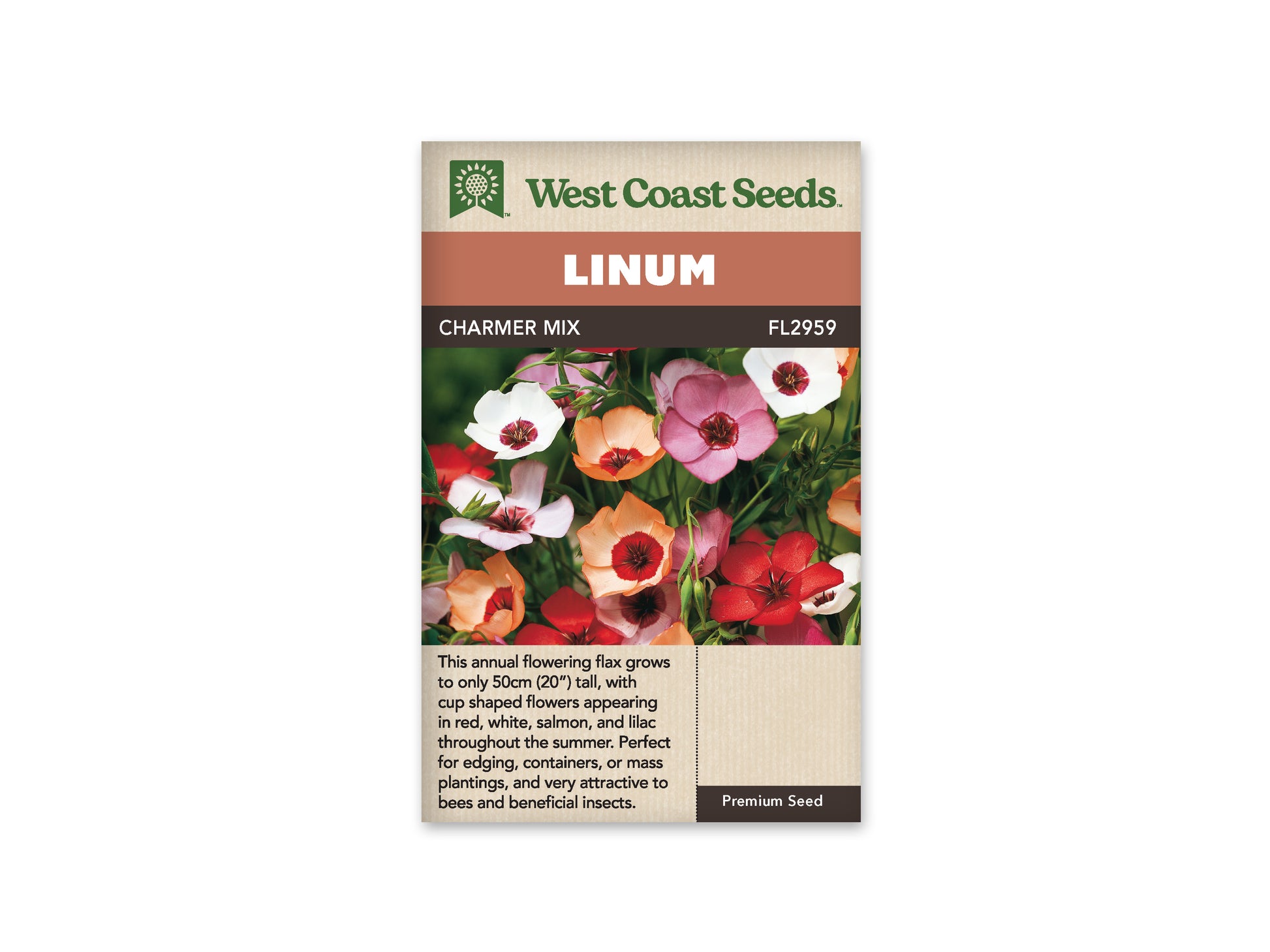 Linum Charmer Mix is a compact annual flax that reaches just 50cm tall, perfect for containers and garden beds. Cup-shaped flowers bloom in vibrant red, white, salmon, and lilac shades throughout the season. For continuous color, sow seeds every two weeks from mid-March through May. This succession planting technique ensures non-stop blooms all summer long. Mass plantings create the most dramatic display of these cheerful, delicate flowers.