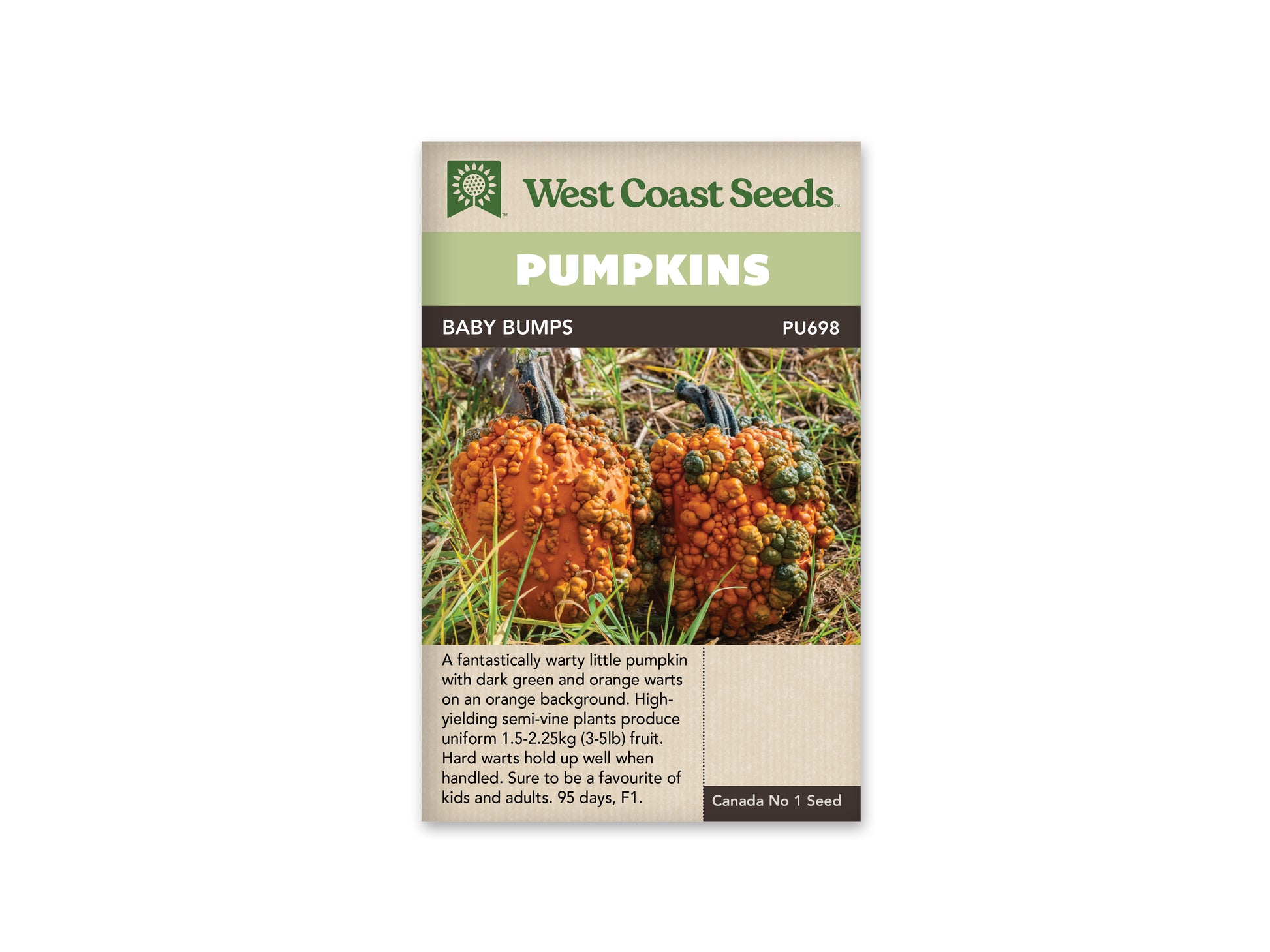 Fantastically warty little pumpkin with dark green and orange bumps on an orange background. Baby Bumps from WCS produces abundant fruit on semi-vine plants, yielding uniform 3-5lb pumpkins perfect for decorating or cooking. The hard warts resist damage during handling and storage. A delightful choice for gardeners of all ages who love unique, eye-catching varieties.