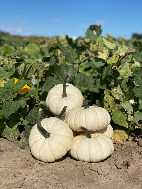 Pumpkin Mooncake WCS produces abundant creamy white, flattened fruits perfect for stacking into impressive fall displays. Each lightly ribbed pumpkin measures 6-8 inches and weighs 3-5 lbs, growing prolifically on vigorous vines. Early maturity ensures reliable harvests across different growing seasons, while the compact shape makes them ideal companions for other stacking varieties like Lemon Cake. Create stunning autumn arrangements with this versatile, productive variety.